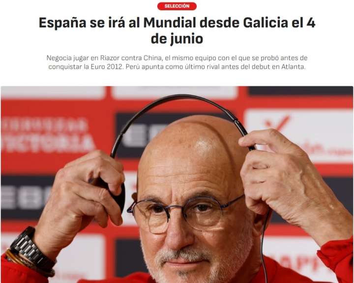 阿斯报消息,西班牙队计划于6月4日在里亚索尔球场(拉科鲁尼亚主场)与中国队进行本土最后一场热身赛,随后将飞往美洲备战美加墨世界杯,随后在世界杯举办地还将进行最后一场热身赛进行演练,对手很可能是秘鲁队。